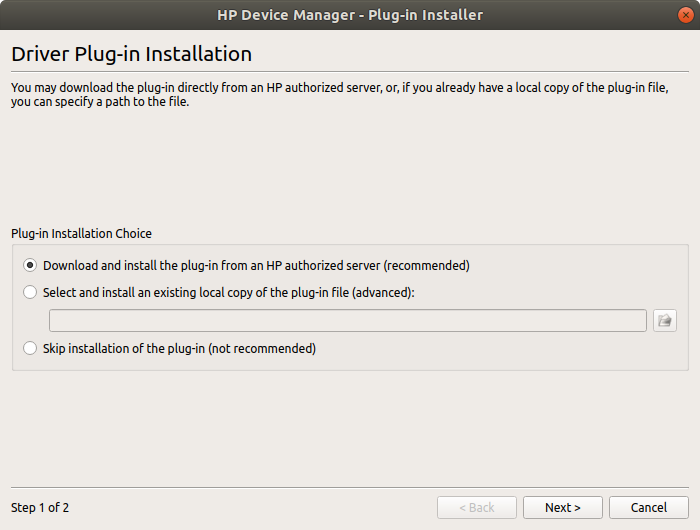 Păstrează fereastra Terminal deschisă. Lansează comanda hp-plugin. Următoarea fereastră ar trebui să apară: