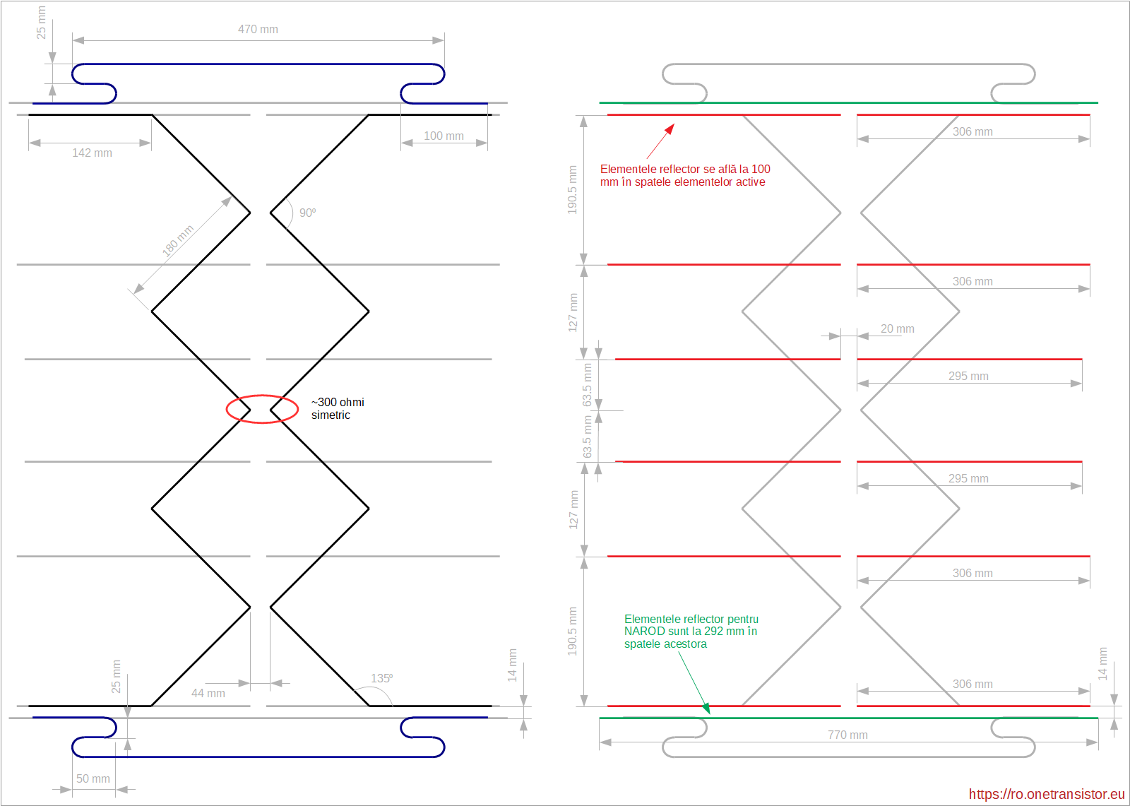 În desenul din stânga poți vedea elementele active ale antenei, cele albastre fiind așa numitele elemnte NAROD; în dreapta sunt elementele tip reflector, cele desenate cu roșu fiind aferente elementelor NAROD. Elementele reflector sunt amplasate la 10 cm în spatele elementelor active, cu excepția celor pentru NAROD, care se află la 29,2 cm în spatele lor. Antena poate fi construită folosind cupru sau aluminiu, fie tijă sau tub (țeavă) cu diametrul de 4 până la 8 mm. Reține că elementele NAROD și reflectoarele lor sunt necesare doar dacă dorești recepționarea benzii VHF-3.