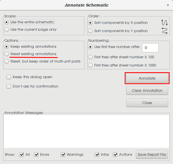 Pentru început, să adăugăm numerotarea simbolurilor (Annotation). Opțiunea se află în meniul Tools – Annotate Schematic. Următorul dialog va fi afișat. Tot ce trebuie să faci este să apeși butonul Annotate. O opțiune ce îți poate fi utilă este aceea de a reseta adnotarea precedentă (Reset existing annotations), în cazul în care ai mai adăugat simboluri după operația de adnotare și dorești renumerotarea tuturor simbolurilor.